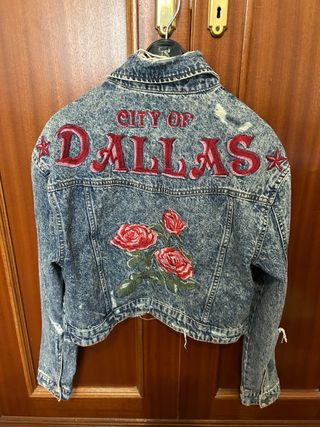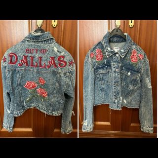 Cazadora vaquera con un diseño único y moderno. - Bordado de flores rojas. - Efecto desgastado y roto. - Corte cropped.