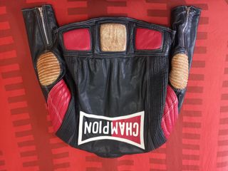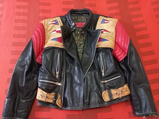 Chaqueta de cuero con un diseño llamativo. - Combinación de colores negro y rojo. - Detalles de diseño en el frente y mangas.