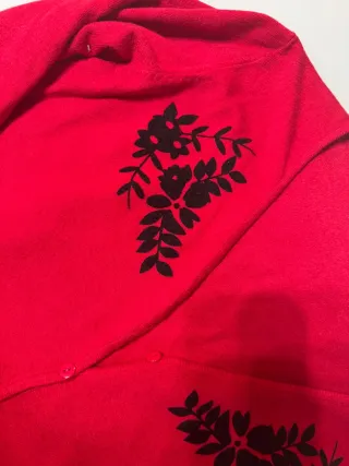 Chaqueta de punto en color rojo con un bonito bordado floral en la parte delantera. Es cómoda y versátil. - Diseño de flores negras bordadas. - Cierre de botones. - Puños y bajo acanalados.