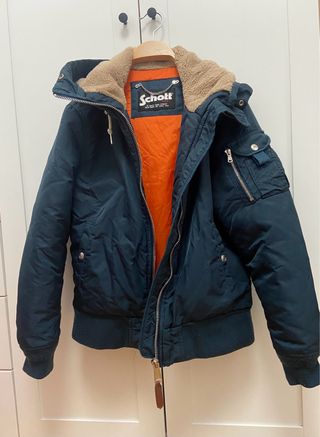 Chaqueta estilo bomber de la marca Schott. - Color exterior azul. - Forro interior de color naranja. - Capucha con borrego. - Bolsillo con cremallera en la manga. - Cremallera frontal. - TALLA S. Ver medidas en fotos. !!! ÚLTIMO PRECIO 45€ !!!