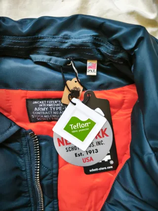 Chaqueta estilo aviador Schott Bros. Inc. con diseño Army Type-U. - Talla M. - Color azul marino. - Forro interior acolchado con ribete naranja. - Incluye bolsa de transporte.