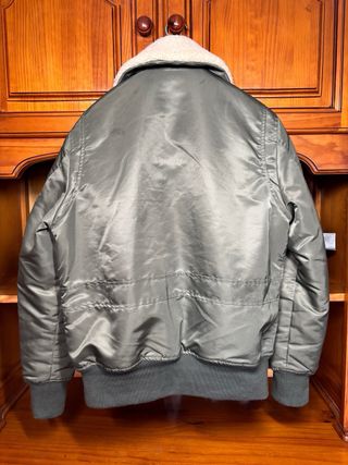 Fabricada en USA. Bastante usada. Los tiradores de las cremalleras de los puños y la central no son los originales. Falta un botón remache en la solapa. Cuello y borde de los puños un poco desgastado. Talla 46, entre la L y la M.