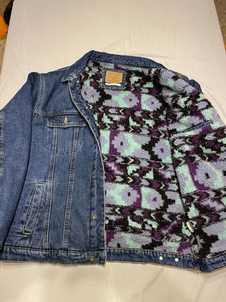 Chaqueta tejana con forro interior de borrego. - Diseño clásico de chaqueta tejana. - Cuello e interiorde borrego excepto mangas para mayor calidez. - Cierre de botones. - Bolsillos frontales. -practicamente nueva -la talla es xs pero talla un poco mas grande, posibilidad de probar .