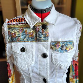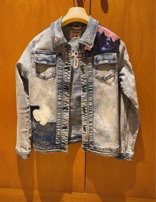 Chaqueta tejana Desigual con un diseño único y llamativo. - Mangas con estampado floral y detalles bordados. - Parche decorativo en el pecho. - Puños y bajo con adornos de pedrería y abalorios.