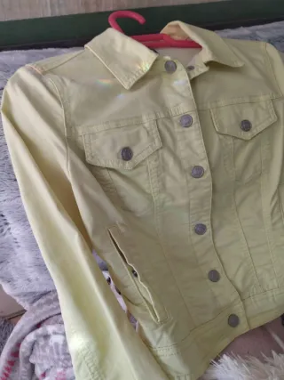 Chaqueta tejana de color amarillo, con un diseño clásico y versátil. - Cierre de botones metálicos. - Dos bolsillos en el pecho con solapa y botón. - Dos bolsillos laterales. - Es más amarilla que en las fotos, es elástica puede ser talla S/M.