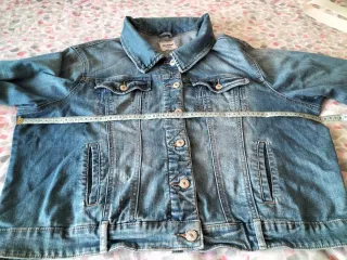 Chaqueta tejana color azul efecto desgastado, marca Dismero Jeans (italiana) talla 42. Dos bolsillos.En muy buenas condiciones, vendo por no usar.Es más bonita al natural que en las fotos.Tiene un bordado en la parte superior izquierda azul y dorado con la letra D de la marca en dorado. Medidas: de hombro a hombro 42 cms.de sisa a sisa 51 cms. y largo total 62 cms.