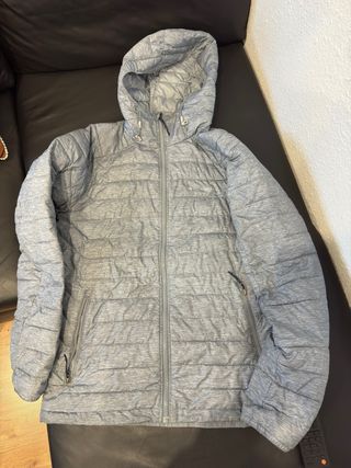 Chaqueta térmica Columbia en color gris, talla M. Presenta algunos roces debido al uso. En tienda cuesta 110€ Como referencia mido 188 y me sobra par centimetros, seria una M/L - Diseño acolchado. - Capucha integrada. - Cierre de cremallera frontal. - Bolsillos laterales con cremallera.