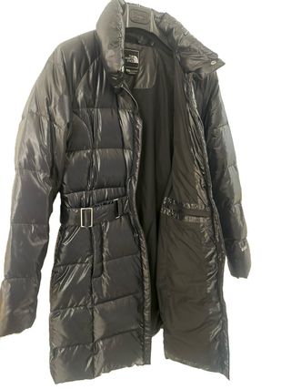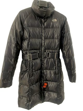 Abrigo acolchado de The North Face con cinturón. Esta chaqueta es una prenda acolchada de mujer de la marca The North Face que utiliza un relleno de plumón de ganso de 600 cuins (pulgadas cúbicas por onza), indicando el nivel de aislamiento térmico, calidad y capacidad de expansión de la pluma, caracterizada por su diseño ligero у calido Desde que me lo compré tuve un enganchón y le puse un parche y ha estado protegido y no ha tenido pérdida de - Diseño largo y brillante. - Cuello alto. - Cierre de cremallera. - Dos bolsillos laterales con solapa y hebilla. - Detalle de dos flores naranjas bordadas en la parte inferior izquierda.