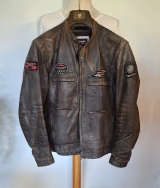 Chaqueta de cuero de la marca Triumph, modelo Heritage. Original. Talla XXL pero este modelo talla como una XL Cuero muy gordo y resistente. Efecto vintage. Aperturas de aireaciones en pecho y espalda. Forro térmico desmontable. Muy poco uso. Sin caídas. Las marcas que se pueden apreciar en el cuero son así de nueva. Efecto desgastado. Colección Heritage de Triumph motorcicles. Precio no negociable. Es una chaqueta de casi 500€