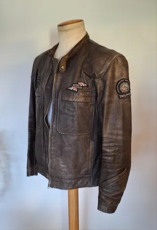 Chaqueta estilo biker de piel con un diseño clásico.Tiene protecciones, cazadora con carácter,estilo rockero,también combinabe casual.Puede ser valida para TL . Esta muy cuidada, tiene efecto desgaste de fábrica, le da un aspecto cafe racer motero. Medidas de axila a axila 57cm Mangas 64cm Hombros 50cm Largo desde arriba de la cremallera hasta abajo 58cm. Mas chaquetas en mi perfil. Redskins, chupa motera, Schott, chupa vintage. - Parches de Triumph y detalles de motociclismo. - Cremallera frontal. - Bolsillos delanteros con solapa.
