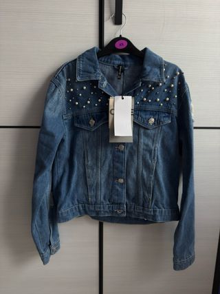 Chaqueta vaquera con un diseño moderno y detalles de perlas.