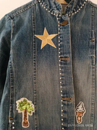 Chaqueta vaquera con detalles únicos y un estilo llamativo. - Adornada con perlas y un parche de estrella dorada. - Incluye parches decorativos de árbol y helado. - Diseño con cuello mao y cierre de botones.