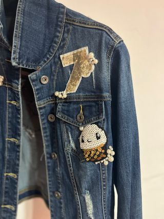 Cazadora vaquera con detalles únicos. - Parche de lentejuelas doradas con el número 7. - Parche de pulpo con lentejuelas y perlas. - Adornos de perlas y lentejuelas.