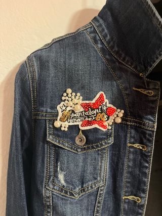Chaqueta vaquera con un diseño único y llamativo. Perfecta para darle un toque especial a tu look. - Decorada con perlas y detalles de estrellas. - Acabado desgastado con rotos estratégicos. - Cierre de botones metálicos.