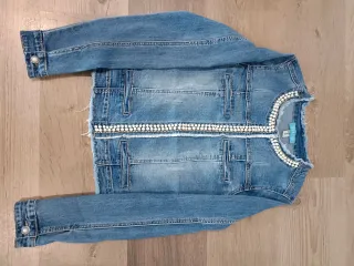 Chaqueta vaquera de la marca Kiabi, con un diseño único adornado con perlas. - Estilo denim clásico. - Detalle de perlas en cuello y bolsillos. - Cierre de botones. - Dos bolsillos en el pecho.