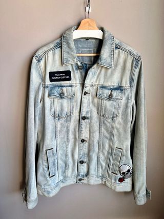 Chaqueta vaquera para hombre con un diseño único y moderno. Perfecta para añadir un toque distintivo a tu estilo. - Parche These ARE my CHURCH CLOTHES en el pecho. - Parche de calavera con rosa en la parte inferior. - Lavado a la piedra para un look desgastado.