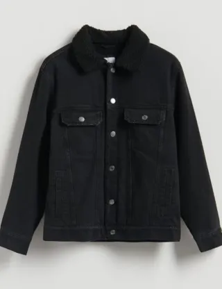 Chaqueta vaquera de color negro con forro interior de borreguito para mayor calidez. - Cuello con acabado de borreguito. - Cierre de botones metálicos. - Dos bolsillos en el pecho con solapa y botón. - Dos bolsillos laterales. - Puños abotonados.