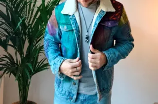 Chaqueta vaquera única con un diseño pintado a mano. - Estilo denim clásico. - Cuello forrado de borreguito. - Detalles de pintura artística en toda la prenda.