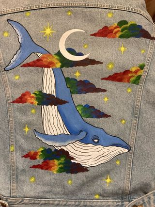 Chaqueta vaquera única con un diseño pintado a mano. - Ballena azul nadando entre nubes arcoíris. - Luna y estrellas. - Estilo artístico y original. - Hago diseños de lo que quieras. Mas arte en instagram: dee93_art