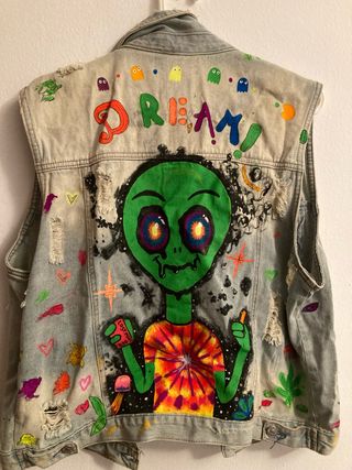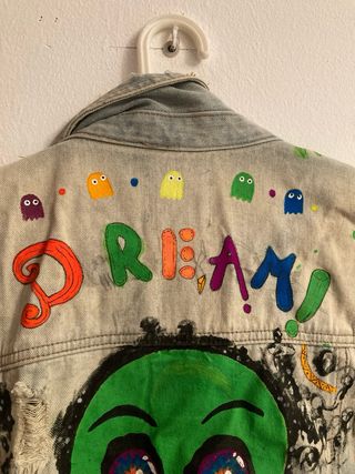 Chaqueta vaquera única, intervenida con pintura. - Diseño original con alien y texto DREAM. - Detalles de fantasía como fantasmas y corazones. - Estilo desgastado y con rotos. Hago diseños de lo que quieras! Mas arte en instagram: dee93_art