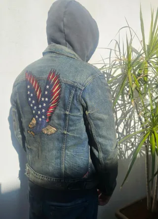 Cazadora vaquera de Ralph Lauren con un diseño llamativo en la espalda. - Parche de águila con diseño de bandera americana. - Estilo clásico de cazadora vaquera. - Talla S Nunca usada, porque es pequeña. El color y los detalles desgastados son del diseño, no por el uso.