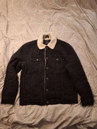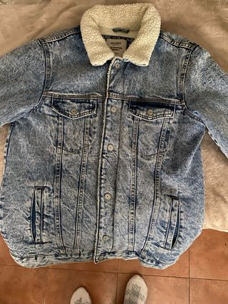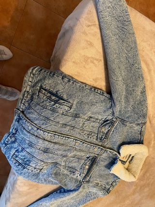 Chaqueta vaquera clásica con un toque cálido y moderno. Se vende por no haber tenido uso ninguno como se puede apreciar ya que me está grande. - Diseño vaquero con efecto desgastado. - Cuello forrado de borreguito blanco. - Cierre de botones metálicos. - Dos bolsillos en el pecho con solapa y botón. - Dos bolsillos laterales.