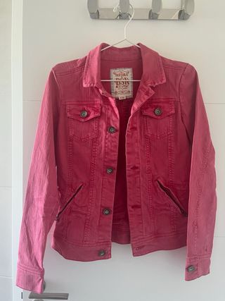 Chaqueta vaquera de Bershka en talla M, con un llamativo color rojo/rosa. - Diseño vaquero clásico. - Tejido elástico para mayor comodidad. - Cierre de botones. - Bolsillos con cremallera.