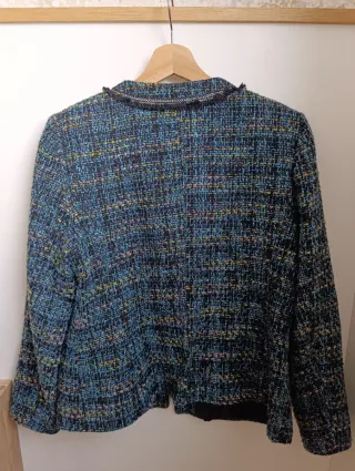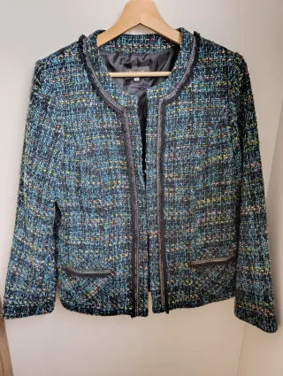 Chaqueta de mujer marca Domigueli, estilo tweed, elegante y muy versátil. Está como nueva, en excelente estado. Bolsillos delanteros útiles. 🔖 Talla: en la etiqueta figura 48, pero talla pequeño 📏 Medidas aproximadas (en plano): – Entre sisas: 48 cm – Largo: 63 cm 👉 Por medidas corresponde más bien a una M / L 🎨 Tejido con mezcla de tonos azules, verdes y detalles multicolor, muy favorecedor. ✨ Ideal tanto para looks formales como para un estilo más casual con vaqueros. Si necesitas más fotos o alguna medida adicional, dime sin problema 💬 #domigueli #chaquetamujer #tweed #chaquetaelegante #tallam