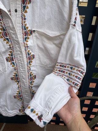 Chaqueta vaquera blanca de Zara con un diseño bordado muy original. - Bordados geométricos en contraste. - Bolsillos en el pecho. - Cierre de botones.
