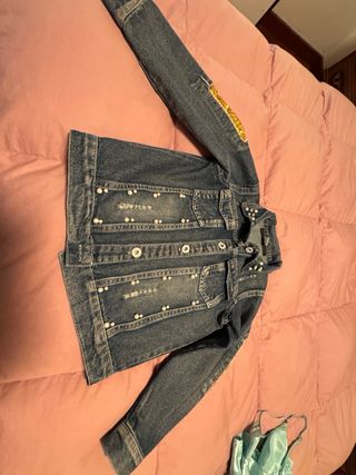 Preciosa chaqueta vaquera para niña, talla XS (equivalente a 4/6). Tiene detalles únicos: - Parches brillantes dorados en las mangas. - Adornos de perlas en el cuerpo. - Lindo parche con ilustración en la espalda. La chaqueta está en buen estado, lista para usar.