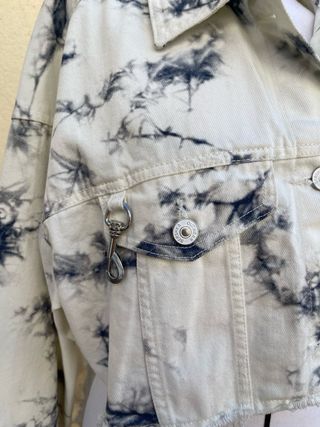 Chaqueta vaquera corta con un llamativo estampado tie-dye. - Diseño cropped. - Acabado deshilachado en el bajo. - Cierre de botones metálicos. - Bolsillos en el pecho. es anchita y corta, queda muy bonita y original. muy cómoda. Bershka talla S. puesta en muy pocas ocasiones.
