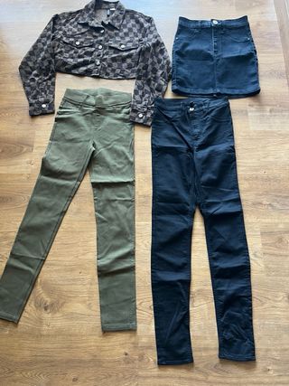 Conjunto de prendas de vestir en tallas XS/S. - Chaqueta con estampado de cuadros talla XS nueva. - Falda vaquera talla S. - Pantalón negro talla S. - Pantalón verde talla S.