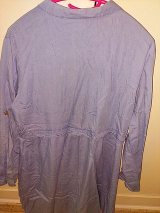 Vestido vaquero finito de mujer con un diseño moderno y cómodo. - Manga larga. - Cuello camisero. - Cierre de botones. - Dos bolsillos en el pecho. - Cintura con detalle fruncido. Es color azul claro en otras fotos se ven más grises x el fras móvil. Tb se puede llevar como cardigan o chaqueta. Zona pino Montano Sevilla. Tb puesto en vinted