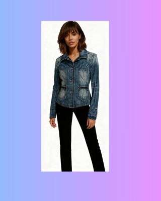 Chaqueta vaquera con un diseño moderno y entallado. Muy cómoda ya es bastante elástico, algodón y licra. - Estampado tie-dye en tonos azules. - Adornos de pasamaneria en el cuello y los bolsillos. - Cierre con corchetes ocultos. - Bolsillos frontales. - Cuello redondo.