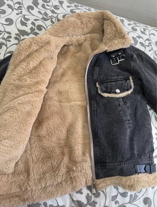 Chaqueta vaquera con forro interior de borreguito y detalles en pelo. - Cuello forrado. - Cierre de cremallera. - Bolsillos delanteros con solapa. - Puños y bajo con detalle de pelo. - Cinturón con hebilla en el bajo.
