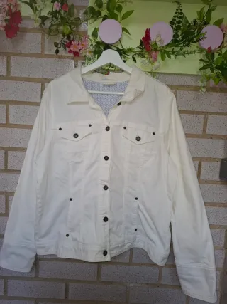 Chaqueta vaquera en color blanco roto, ideal para entretiempo. Tejido resistente pero cómodo, con bolsillos delanteros y cierre de botones. Muy fácil de combinar tanto con vestidos como con pantalones. 💕🛍💫 🌺 Talla: 48 🍃 Marca: MSMode 💫 Estado: Perfecta! Cuidada con mimo. #Chaquetas_arantxa 🔖 Etiquetas: #ChaquetaVaquera #MsMode #Talla48 #CazadoraVaquera #Box02VER