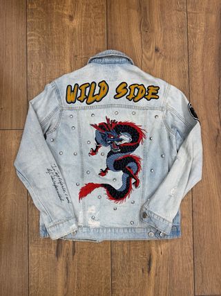 Cazadora vaquera Desigual con un diseño único y llamativo. - Mangas y detalles bordados con motivos coloridos. - Parches decorativos en bolsillos y parte frontal. - Acabado desgastado en negro.