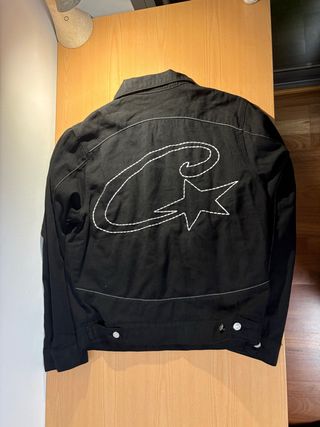 Chaqueta vaquera de color negro con un diseño bordado en la espalda. - Diseño de estrella y curva bordado en blanco. - Cierre de botones metálicos. - Costuras blancas visibles.