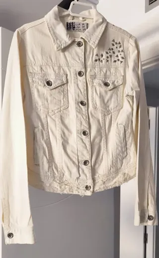 Chaqueta vaquera de Zara en color blanco, talla S. Está en perfecto estado, como nueva. - Diseño clásico. - Cierre de botones. - Bolsillos en el pecho.