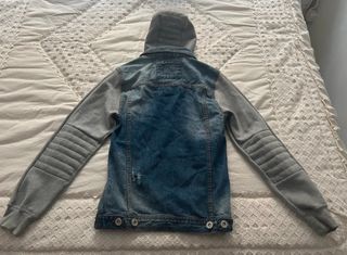Chaqueta vaquera con un diseño moderno y detalles únicos. - Cuerpo principal en tejido vaquero azul. - Mangas y capucha en tejido de punto gris. - Acabado desgastado y con rotos. - Cierre de botones metálicos.