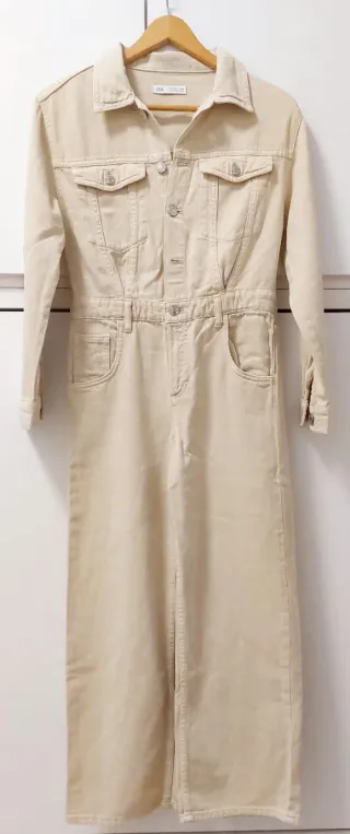 Mono vaquero de la marca ZARA en color beige. Un básico versátil para tu armario. - Diseño tipo chaqueta con botones. - Cintura marcada. - Bolsillos frontales.
