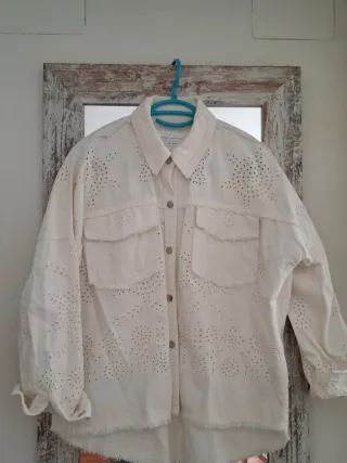 Chaqueta vaquera de la marca Zara en color blanco. Presenta un diseño moderno y versátil. - Cierre de botones metálicos. - Dos bolsillos en el pecho con solapa. - Cinturón a juego para ajustar la cintura. - Puños abotonados.