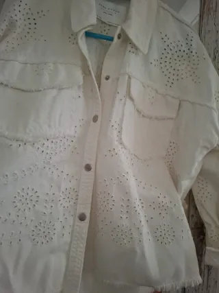 Chaqueta vaquera de Zara con un diseño único. - Color blanco. - Detalle de bordados calados. - Bolsillos delanteros con solapa. - Puños y bajo deshilachados.
