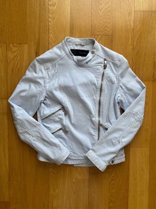 Chaqueta estilo biker en tejido vaquero. Color: Azul Claro Perfecta para temporada de primavera. En muy buen estado. - Diseño con cremallera asimétrica. - Bolsillos frontales con cremallera. - Cuello redondo con cierre de botón a presión.