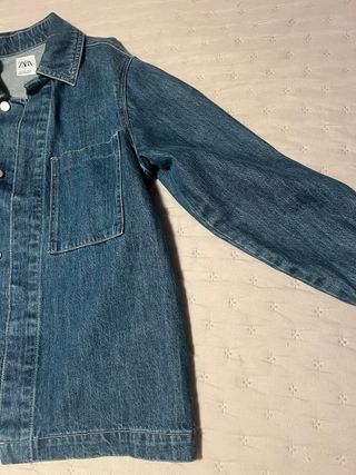 Chaqueta vaquera de Zara para niño, talla 11/12 años (152 cm). - Diseño clásico de denim. - Forro interior de borreguito para mayor calidez. - Cierre de botones. - Bolsillos en el pecho y laterales.
