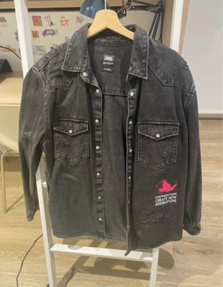 Chaqueta vaquera de Zara con un diseño moderno y detalles únicos. - Color negro con efecto desgastado. - Cierre de botones. - Dos bolsillos en el pecho. - Estampado gráfico en la parte inferior.