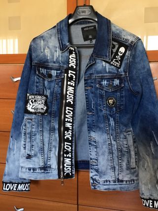 Chaqueta vaquera con un diseño moderno y detalles únicos. - Parches decorativos con calavera y texto. - Cinta con texto LOVE MUSIC en cremallera y puños. - Efecto desgastado y rotos. - Estilo urbano.