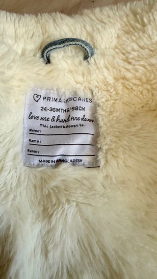 Preciosa chaqueta vaquera para bebé, de la marca Primark. Está en muy buen estado. - Talla para bebé. - Forro interior de borreguillo blanco muy suave. - Cierre de botones.