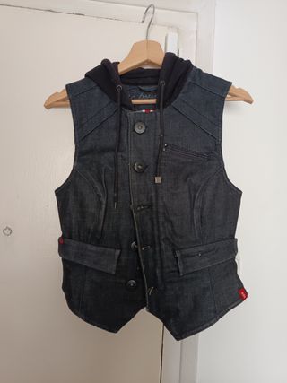 Chaleco vaquero con capucha integrada. Diseño moderno y versátil. - Tejido vaquero resistente. - Capucha de tela suave. - Cierre de botones. - Bolsillos decorativos en la parte inferior.