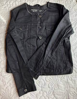 Chaqueta vaquera de la marca Gap en color negro y talla S. Presenta un diseño moderno con cuello deshilachado. - Cierre de botones metálicos. - Dos bolsillos en el pecho con solapa. - Puños abotonados.